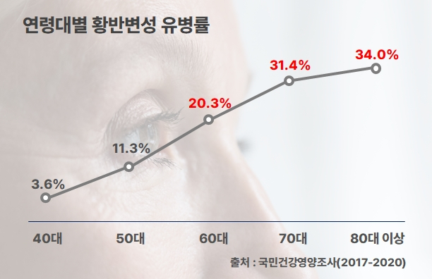 이러한 황반 질환은 나이가 들면서 겪게 되는 안구 조직의 변화에 따라 발생하기도 한다. 대표적으로 ‘나이관련황반변성(Age-related macular degeneration)’은 노화 과정에서 생기는 황반 부위의 변성으로 인해 중심시력 저하를 일으키는 질병이다. 고령층에서 실명을 유발하는 가장 흔한 원인으로 꼽힌다. 초기에는 특별한 자각 증상이 없어 병이 상당히 진행될 때까지 본인이 인지하지 못하는 경우가 많아 더욱 위험하다.